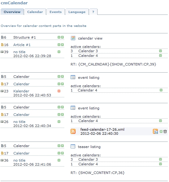 on the right you see what kind of cmCalendar CP it is; eventlisting, teaserlisting or minicalendar
