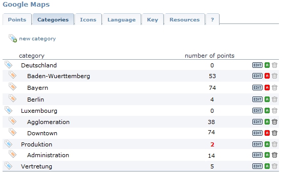 do not attach points to parent categories! These points will NEVER show up in frontend! (The number of points appears red in the listing in this case!)