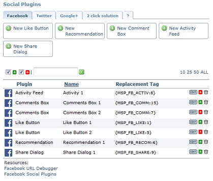 <note> Deleting a plugin here does not automatically delete the Replacement Tags you added to your site (most likely to your template). The RT's are not rendered anymore when a plugin is deleted. The entries/actions in the Facebook sites of the users will remain though!