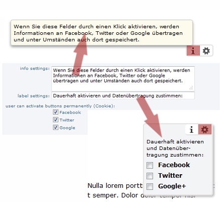 When activated all Facebook-Likeit, Twitter Tweet and Google+ buttons will be collected and displayed on the page within the 2 click solution. The 2 click solution appears on first encounter of a RT in the HTML Code (Order: Facebook, Twitter, Google) or, if present, replaces {MSP_TWOCLICK}.