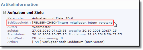 Artikel, die zugangsgesichert werden sollen, werden innerhalb der Artikelbasisinformation in den Schlüsselwörtern entsprechend „getaggt“.