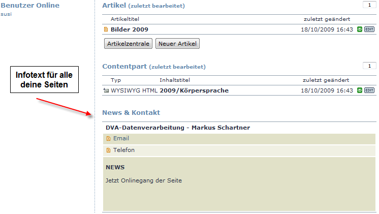 Sie müssen eine Seite im Netz erstellen auf denen Sie die “News” Seite pflegen. mit folgenden Code können Sie dann auf diese Seite zugreifen. Dieser Code ist unter “Backend Standardtext” einzutragen.
