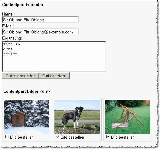Ein Contentpart, hier z.B. Bilder <div>, soll Daten zu jedem Bild an ein Formular übergeben. Der aktive, vom Benutzer bedienbare Teil ist in diesem Beispiel eine einfaches Kontrollkästchen (checkbox). Der passive Teil übergibt Bildparameter zum jeweiligen Bild.