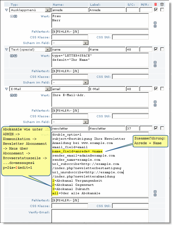 double_optin=1 subject=Bestätigung Ihre Newsletter Anmeldung bei www.example.com email_field=email name_field=anrede+ +name sender_email=admin@example.com sender_name=example.com url_subscribe=http://example.com/index.php?newsletterbestaetigung url_unsubscribe=http://example.com/index.php?newsletterabmeldung 1=Abokanal Vergangenheit 2=Abokanal Gegenwart 3=Abokanal Zukunft all=Oder alle Abokanäle