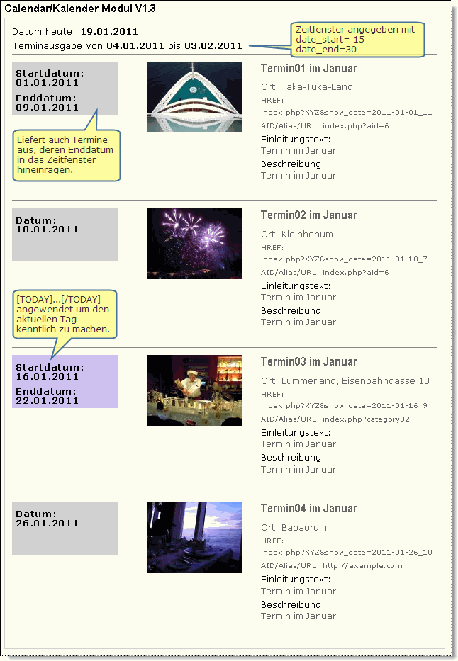 The output (show_past=1) only makes sense if either a static time window (date_start= date_start=01/06/2011 and date_start=12/31/2011) or a sliding time window forward to the current date (date_start=-15 and date_start=30) is set.