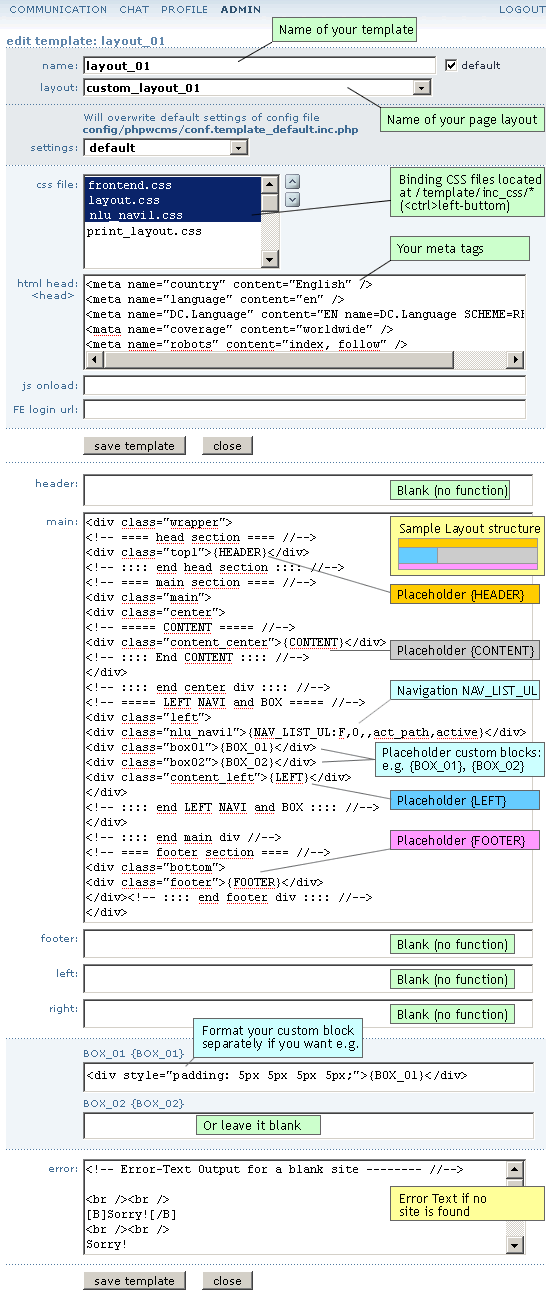 Each template needs a page layout. Therin you can switch basic parameters. (One and the same page layout can be connected to more than one template).