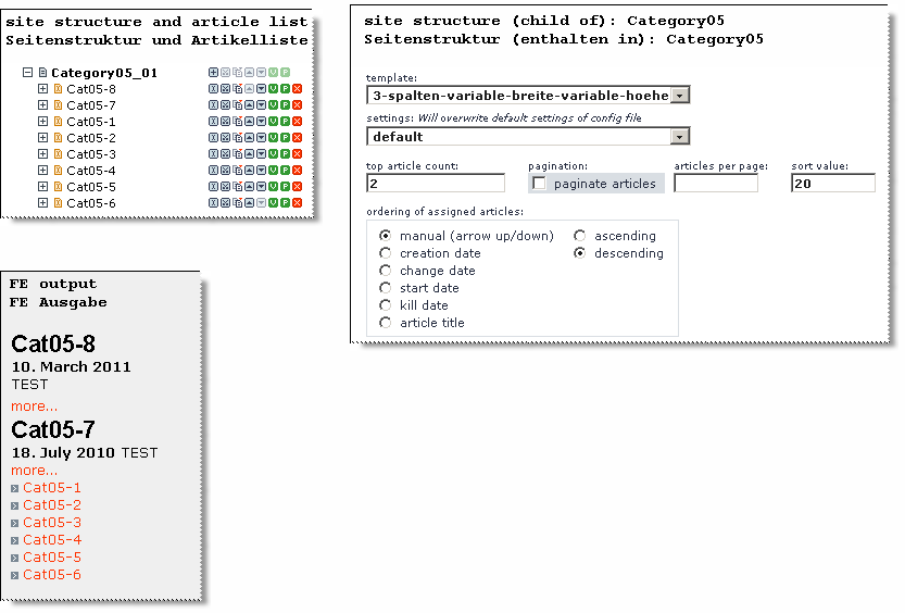 To get into article listing mode you'll simply enter a number > 0 which ist defining the number of displayed articles. (articles of this category will now be delivered showing their “Summary”- text only one after the other. In this list overview only the article heads (the “Summary”- text and a picture) is displayed without their CPs).