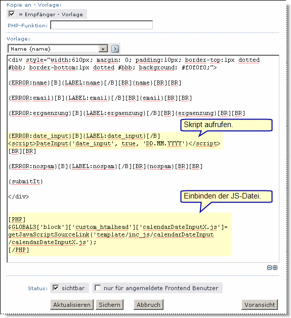 <div style="width:610px; margin: 0; padding:10px; border-top:1px dotted #bbb; border-bottom:1px dotted #bbb; background: #f0f0f0;"> {ERROR:name}[B]{LABEL:name}[/B][BR]{name}[BR][BR] {ERROR:email}[B]{LABEL:email}[/B][BR]{email}[BR][BR] {ERROR:ergaenzung}[B]{LABEL:ergaenzung}[/B][BR]{ergaenzung}[BR][BR] {ERROR:date_input}[B]{LABEL:date_input}[/B] <script>DateInput('date_input', true, 'DD.MM.YYYY')</script> [BR][BR] {ERROR:nospam}[B]{LABEL:nospam}[/B][BR]{nospam}[BR][BR] {submitIt} </div> [PHP] $GLOBALS['block']['custom_htmlhead']['calendarDateInputX.js']= getJavaScriptSourceLink('template/inc_js/calendarDateInput/calendarDateInputX.js'); [/PHP]