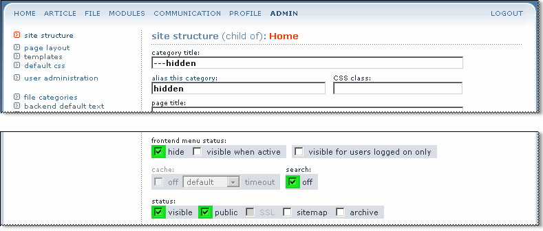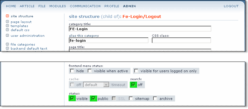 frontend menu status: [ ] hide [ ] visible when active [x] visible for users logged on only status: [x] visible [x] public [ ] SSL [/] sitemap