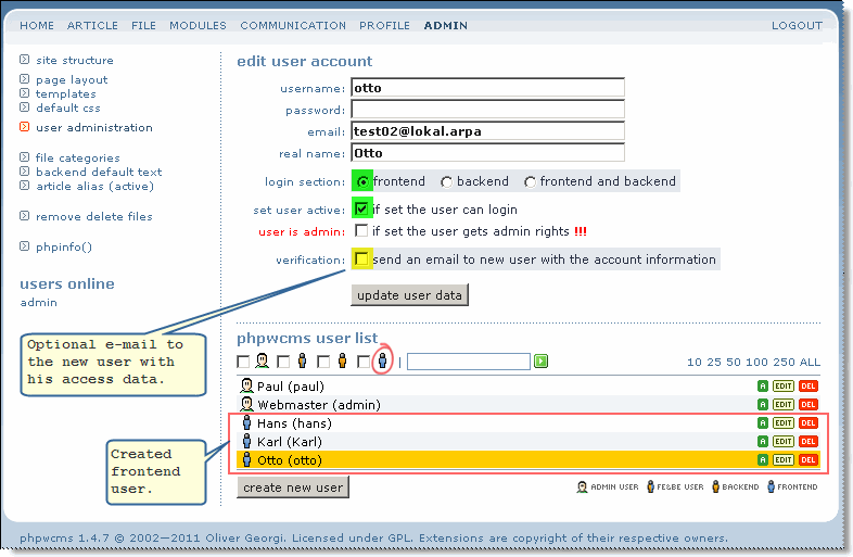 login section: [x] frontend [ ] backend [ ] frontend and backend set user active: [x] if set the user can login user is admin: [ ] if set the user gets admin rights !!! verification: [/] send an email to new user with the account information