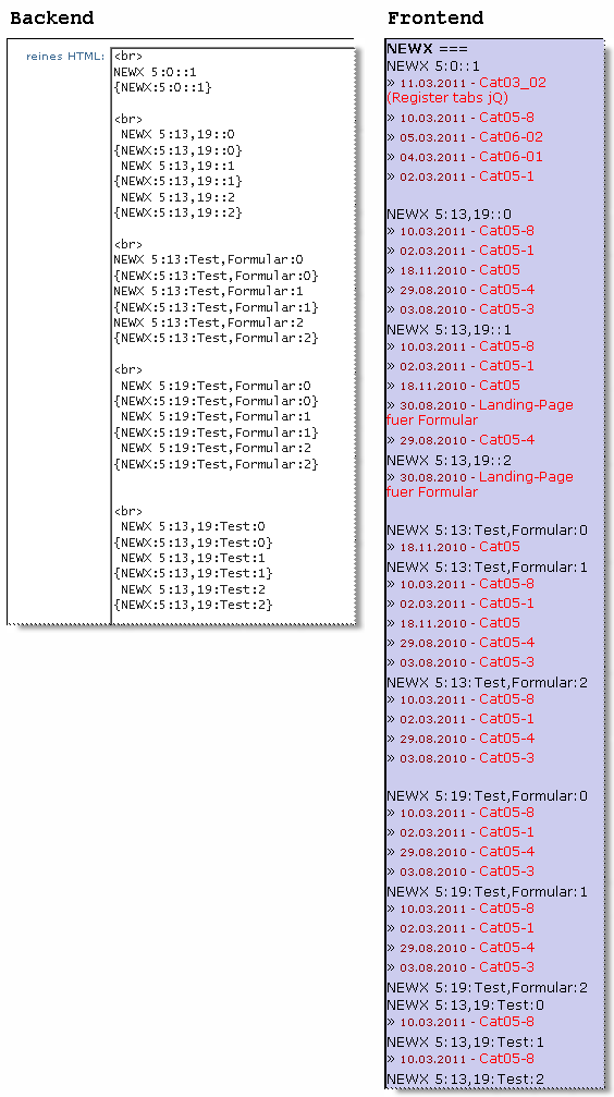 TAG: {NEWX: Counter : Category-IDs : Keywords : Mode [hidden categories]} is a “cut-out piece of code from the System frontend” enhanced by the possibility to search from or below one or more given categor(y)ies. This is especially helpful for multilingual pages.