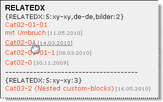 {RELATEDX:5:tip,top,flip,flop:2} → Output: The title link of the first five visible keyword matching articles, at non hidden category_02 (ID=2). (“not hidden” see note above and V1.3).