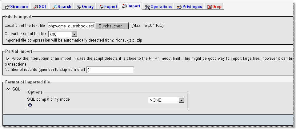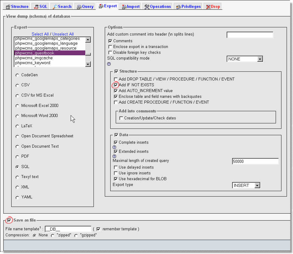 If there is an empty table “phpwcms_guestbook” in your target db: